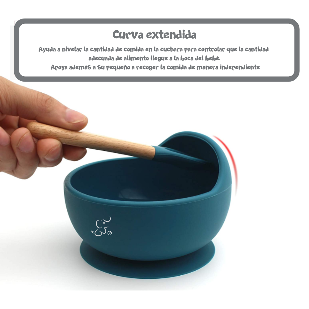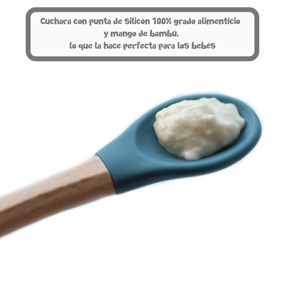 Este set te ayudará a introducir sólido en la dieta de tu bebé y apoya en la transición a la alimentación independiente. La base de succión del apoya en que el plato no se caiga, deslice o se volee. Increíble para uso en sillas altas o mesas. A diferencia de otras cucharas, al la punta ser 100% de silicón hace que no lastime las encías de tu bebé y apoya también en los momentos de dentición y el mango es de bambú lo que la hace de fácil agarre.