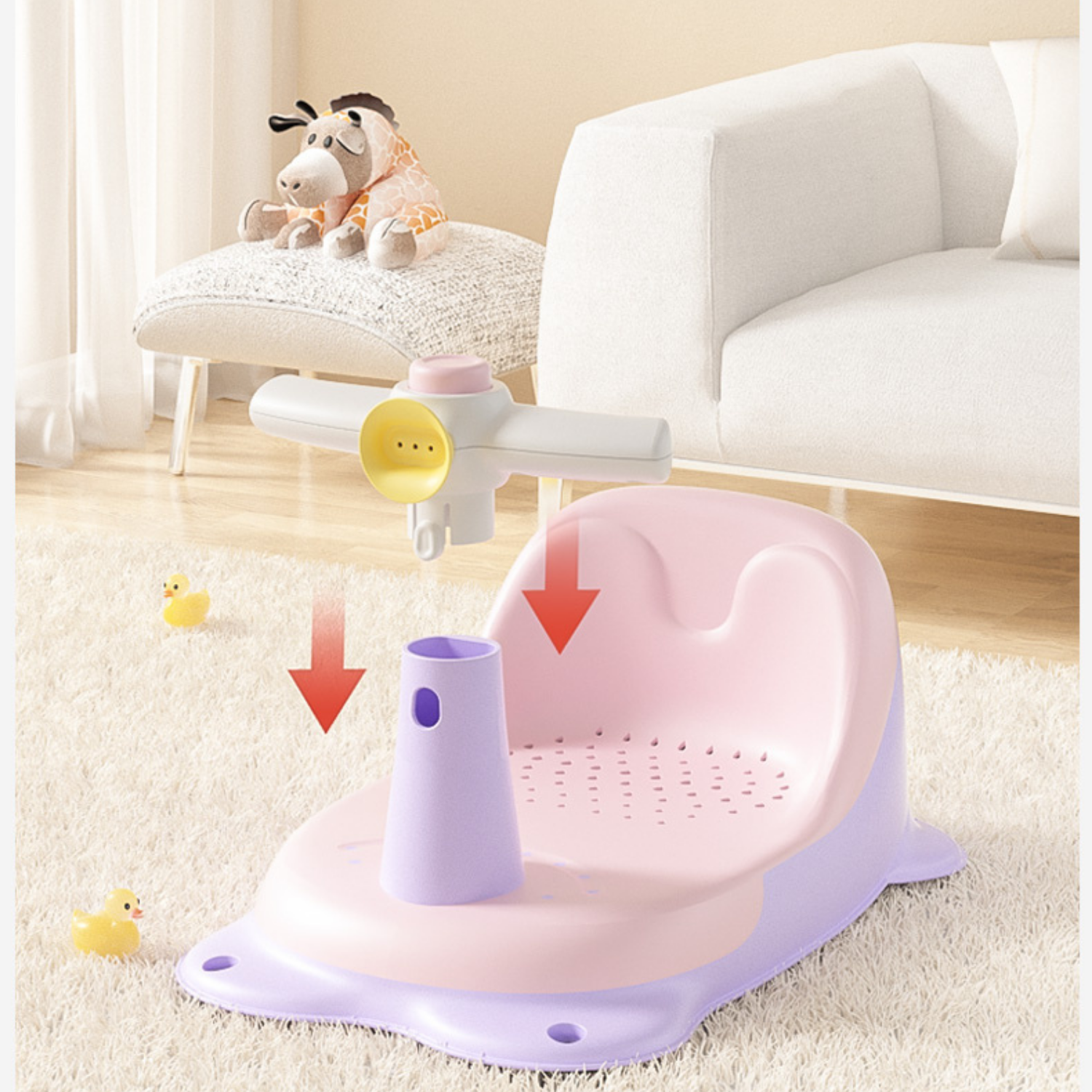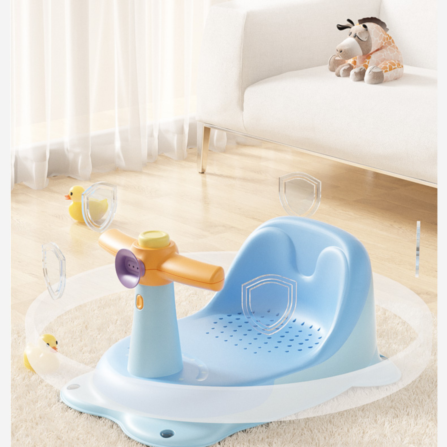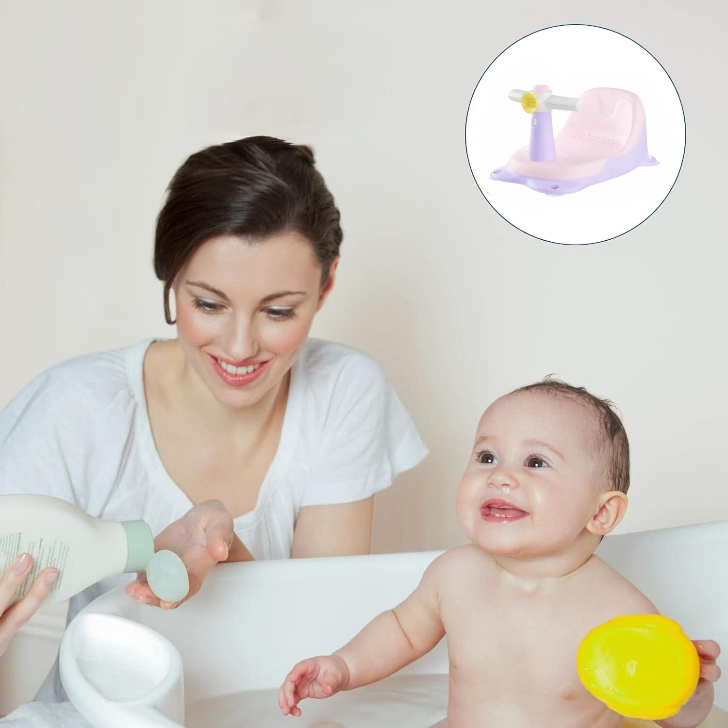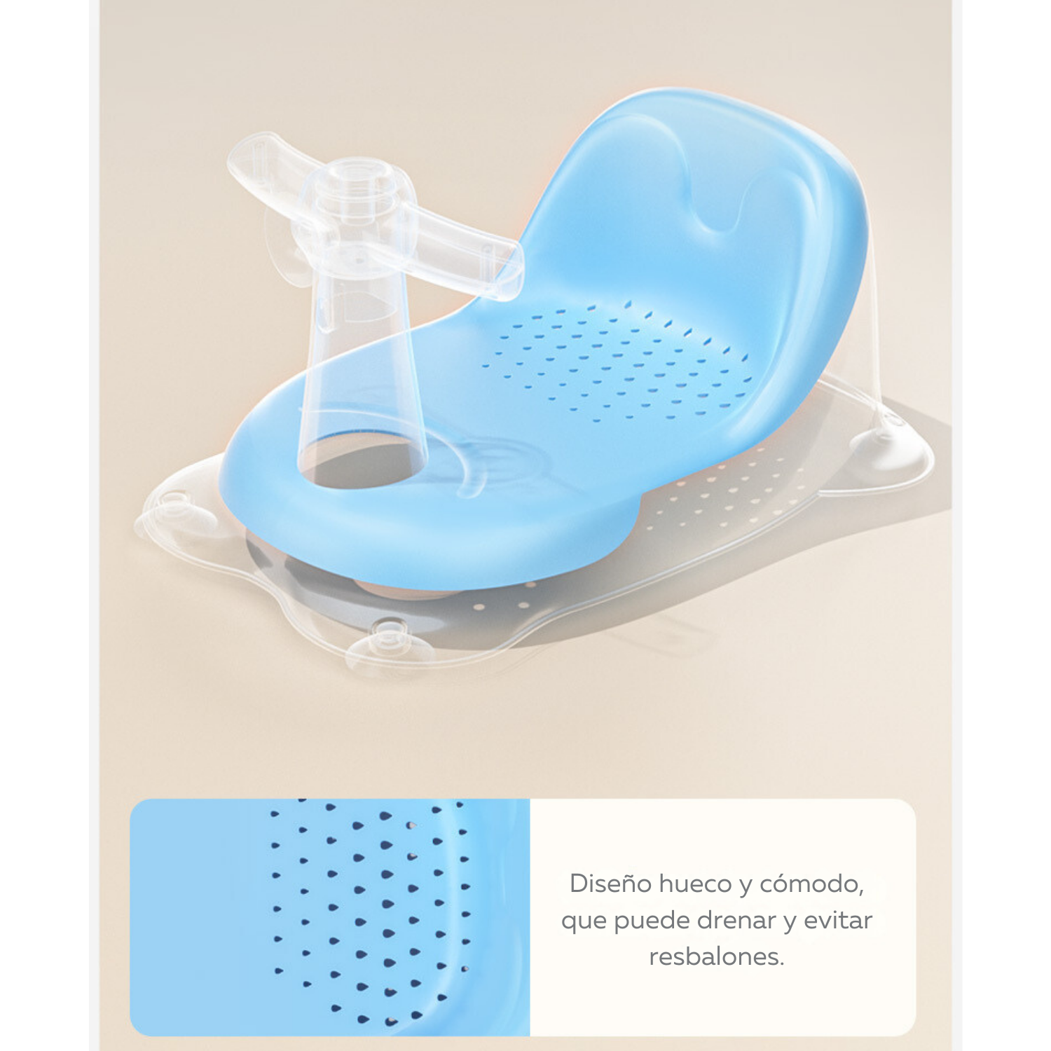 La parte inferior antideslizante del asiento hace que la rutina de baño de su bebé sea mucho más fácil y segura. Su diseño ergonómico con contorno suave permite un baño cómodo y seguro para su bebé. El asiento de goma antideslizante con asas para sujetar garantiza que el bebé esté sentado de forma segura.