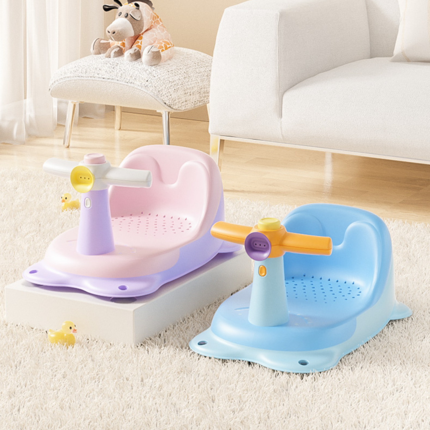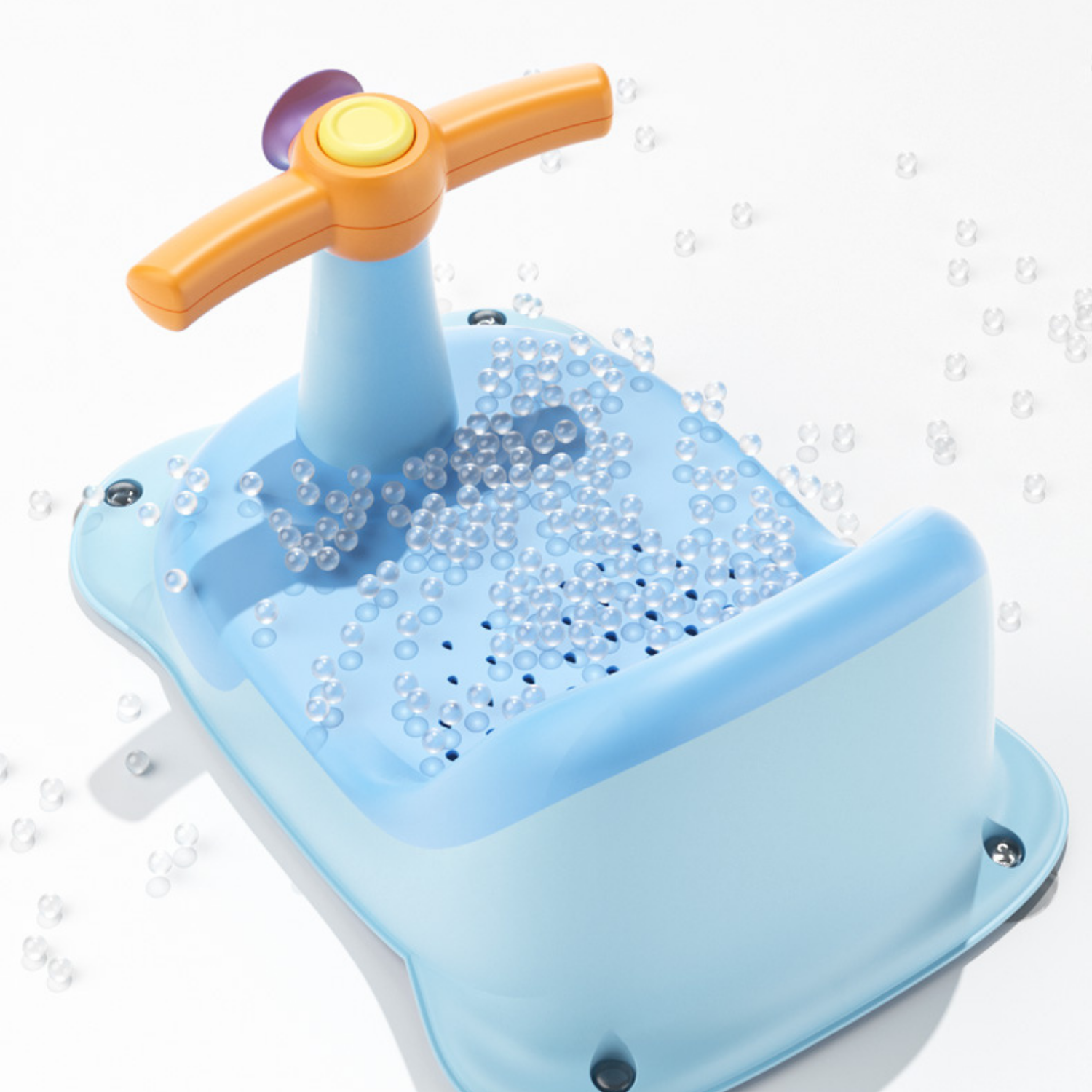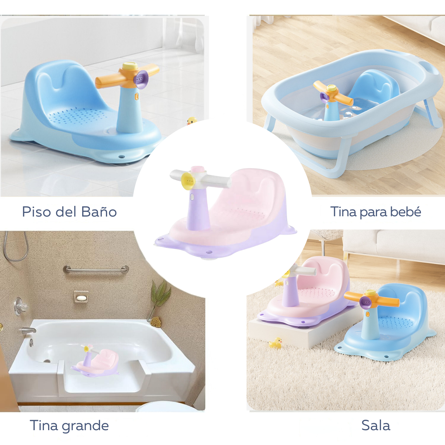El baño es un momento relajante y divertido para la mayoría de los bebés, además de la parte de higiene. Conviene que, desde el principio, elijan los accesorios y el lugar más adecuado para bañarlos ya que, de ese modo, podrán despreocuparse y disfrutar de este momento con ellos. Nuestro asiento de baño para bebés, está diseñado idealmente para bañar a su pequeño sentado.