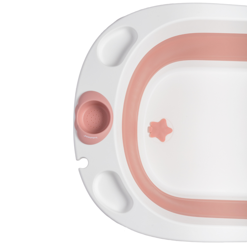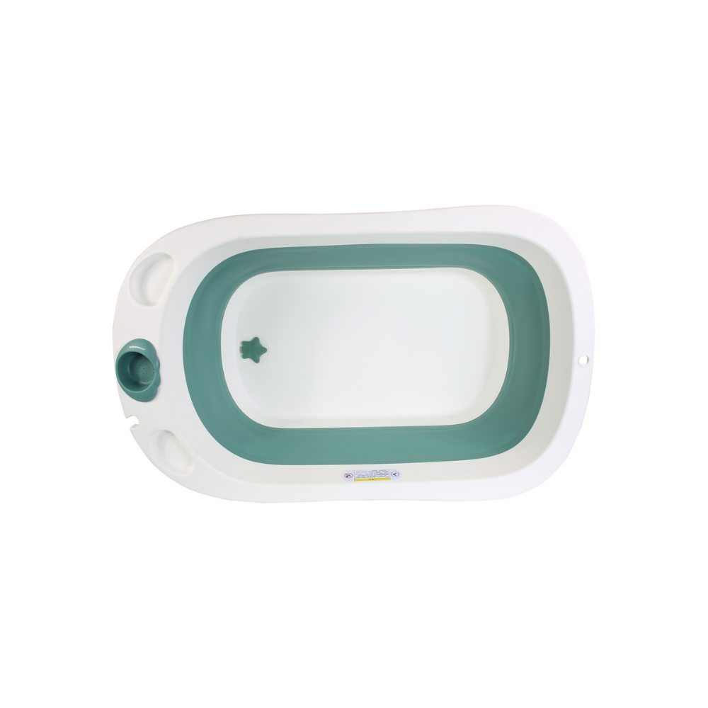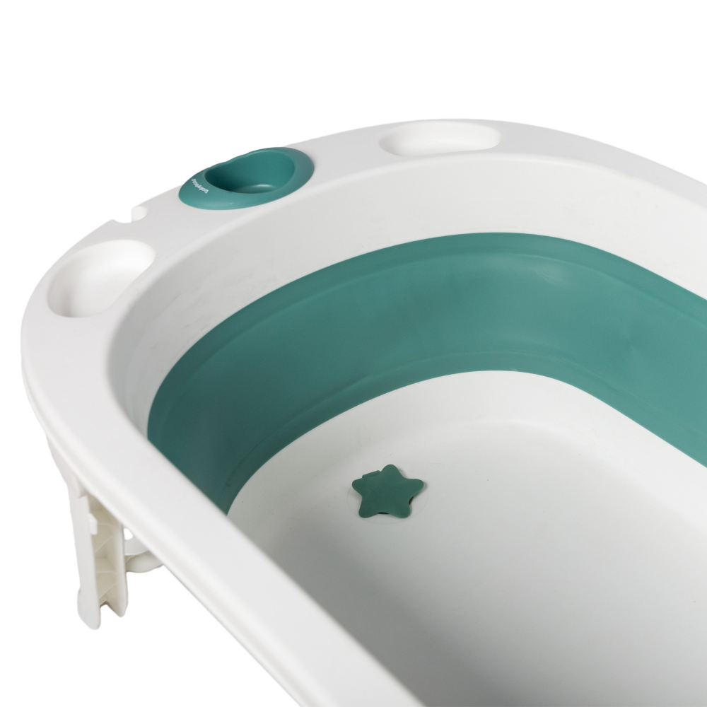 Por su diseño plegable no ocupa mucho espacio a la hora de guardarlo y cuenta con un orificio para colgarla. Tiene 2 posiciones,, se expande para poder bañar tanto a bebés recién nacidos como a niños más grandes. Además se puede poner en posición reclinada para ayudar en el momento de bañar a un recién nacido que aún no sostiene por sí solo la cabeza y el torso, y así mantenerla fuera del agua. Cuenta con un orificio de drenaje inferior con tapón, para sacar el agua con mayor facilidad y un espacio para poner el jabón y shampoo.